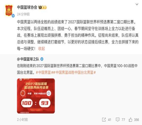 随后,@中国篮球协会 发文祝贺:中国男篮以两场全胜的战绩结束了2027国际篮联世界杯预选赛第二窗口期比赛。本次征程,队伍迎难而上、团结一心,春节期间坚守在训练场上全力以赴进行备战,在赛场上展现出顽强拼搏、勇于担当的精神作风。征程尚未结束,队伍将认真总结与调整,继续精进打磨细节,以更好的状态迎接后续比赛,全力去拼接下来的每一场硬仗!