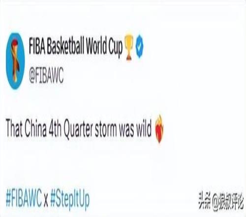 赛后,FIBA官方点赞中国男篮发文:“中国男篮在第四节打出的那波风暴真是太猛了!”