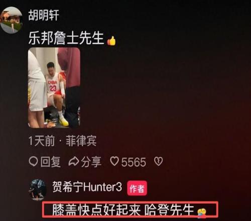 根据后卫贺希宁的社交媒体动态,他在评论区中回复胡明轩:“膝盖快点好起来,哈登先生”。