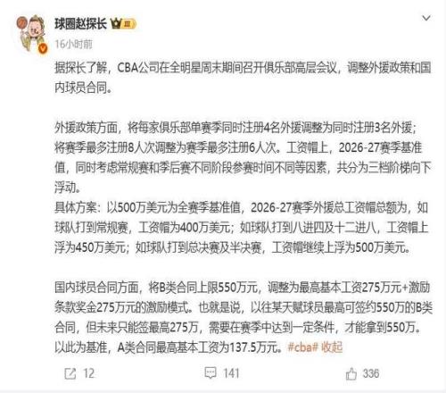 根据媒体人所讲,CBA公司在全明星赛期间召开高层会议,下赛季每支球队最多可以同时注册3名外援(本赛季为4名),下赛季外援注册人次调整为6人次(本赛季为8人次,上赛季没有限制);另外关于外援工资帽的问题,只打常规赛的球队外援工资帽是400万美元,打到季后赛12强或者8强的球队,外援工资帽是450万美元,半决赛(四强)的球队外援工资帽是500万美元。
