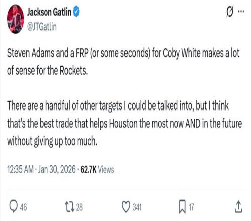 其中火箭媒体人Jackson Gatlin更是支招火箭队,可以尝试打包赛季报销的亚当斯+一枚首轮签或者数枚次轮签尝试追求科比怀特。