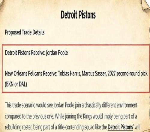美媒《Fadeaway World》撰文建议,活塞可以打包哈里斯、萨瑟以及2027年的次轮签送到鹈鹕,换回普尔。