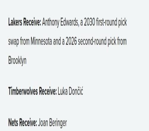 因此,布鲁克林篮网被纳入交易中。篮网正需要约翰-贝林杰这样的年轻中锋,来搭档叶戈尔-杰明,他们的薪资空间可以用来吸纳部分合同,而送给湖人的次轮签则算是这笔交易的添头,让筹码更具吸引力。
