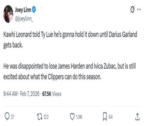 快船随队记者Joey Linn也曝出,小卡对于哈登与祖巴茨的离队感到失望,但对本赛季快船队的前景仍有期待。