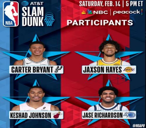 魔术新秀、两届扣篮王杰森-理查德森之子贾斯-理查德森,顶替伤退的杜伦参加扣篮大赛,其余3位参赛选手是湖人中锋海斯,以及热火前锋凯沙德-约翰逊与马刺新秀布莱恩特。