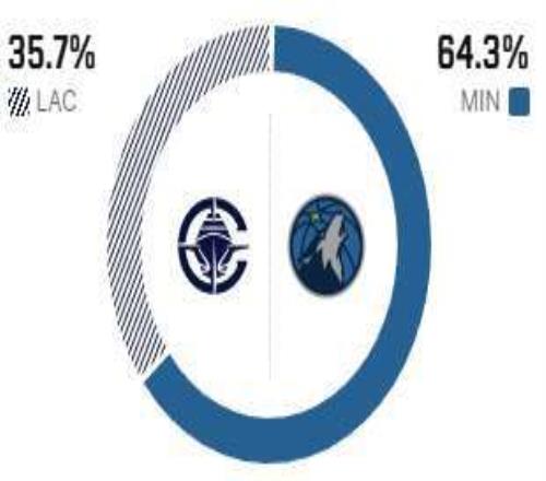 反观森林狼,上一场比赛意外不敌鹈鹕,近期状态起伏不定,此前也曾负于摆烂的灰熊。上场比赛森林狼的防守端漏洞明显,锡安与贝联手轰下59分,且多数得分均来自篮下强攻,彻底击穿了森林狼的内线防线。即便戈贝尔交出12分16篮板2抢断3盖帽的全面数据,仅凭一己之力也难以撑起球队整体防守,森林狼若想稳住战绩,还需在攻防两端提升整体性与协同性。本场比赛,快船的加兰、马瑟琳继续缺阵,森林狼新援苏道姆出战。赛前,ESPN看衰森林狼,预测快船本场比赛的胜率只有35.7%,而森林狼的胜率高达64.3%。