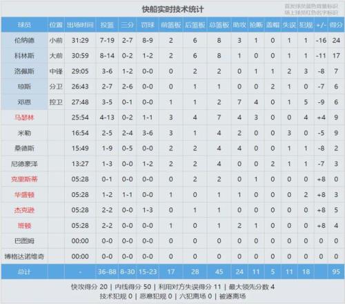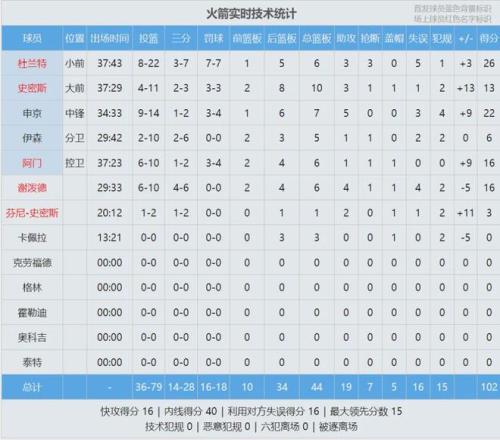 此役过后,火箭升至西部第三,落后第二的马刺3个胜场。最后看看数据: