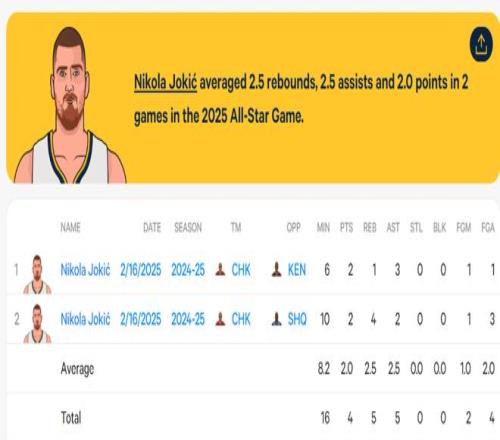 数据媒体StatMuse晒出了约基奇最近两年全明星的数据,今年是5分钟,1中0拿0分2篮板0助攻。