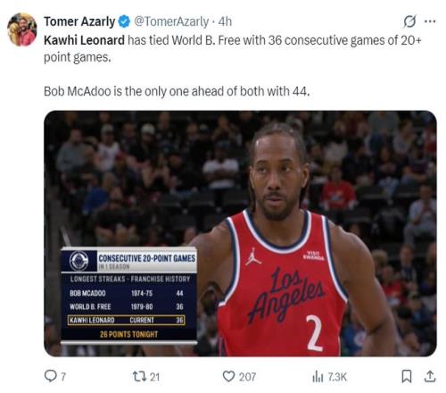 这场比赛后小卡已经连续36场比赛拿到20+排在快船队史第二,他仅次于麦卡杜的连续44场20+,战神卡也再度刷新自己连续上双的场次。