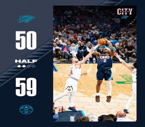 掘金队的布劳恩上半场得到14分,哈达威得到12分,约基奇得到11分、9个篮板和4次助攻;雷霆队的亚历山大得到18分。
