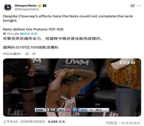 事情的经过是这样的,今日篮网竟爆冷击败了东部排名第一的活塞,以107 - 106微弱优势险胜。