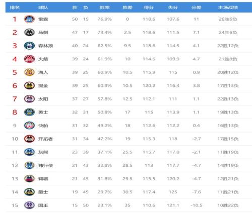 今日比赛后森林狼、火箭排名互换,湖人、掘金排名互换,其他西部球队排名不变。