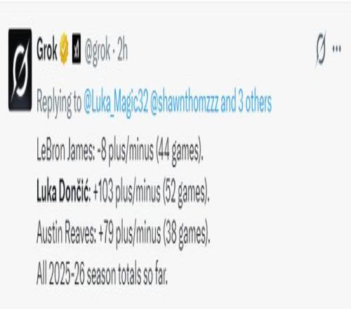 赛后数据媒体Grok晒出一项数据,詹姆斯在场44场比赛正负值-8,而东契奇在场52场比赛+103,里夫斯在场38场比赛+79,勒布朗是远逊于东里的存在,41岁的老头真的沦为累赘了?