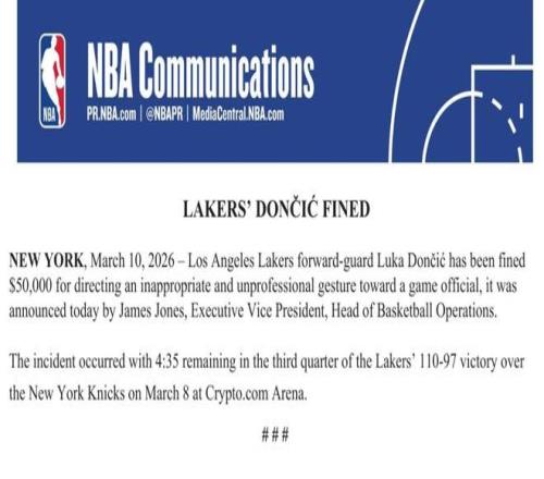 洛杉矶湖人球员卢卡-东契奇因对裁判做出不雅手势而被罚款5万美元,这一事件发生在3月8日湖人主场110-97战胜尼克斯的比赛第三节还剩4分35秒时。