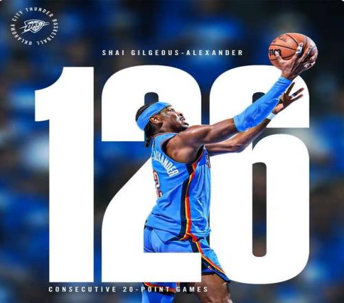 近日,亚历山大得到35分15次助攻9个篮板的准三双,率残阵雷霆击溃掘金。最后时刻,亚历山大连中2记三分,带走胜利。本场得到35分,也让亚历山大连续得分20+的场次达到126场,追平张伯伦在1962年缔造的纪录。赛后,亚历山大表示,和那样的人相提并论,这很特别。