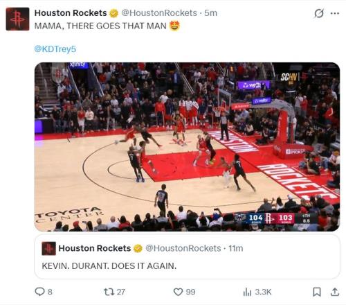 火箭官方晒KD神之一手!休媒称关键球有他太轻松:25次30+创历史