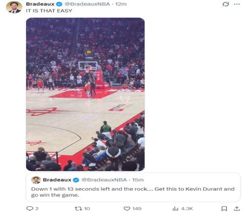 休媒Bradeaux写道:比赛还剩13秒火箭还落后,那就把该死的球给杜兰特,然后他会带我们走向胜利。
