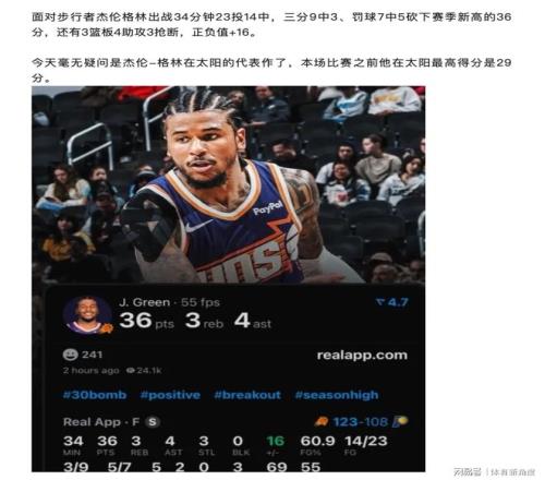 反观杰伦 - 格林,近期他的表现着实令人眼前一亮,颇有些出人意料。就在昨日与步行者的对决中,杰伦 - 格林斩获了其太阳生涯的首个30 +得分,这一出色发挥着实让“和中堂”大为震惊。在那场比赛中,格林出战34分钟,投篮23中14,三分球9投3中,最终拿下36分3个篮板4次助攻。如此高的进攻效率,让人不禁觉得太阳在这笔交易中赚得盆满钵满。