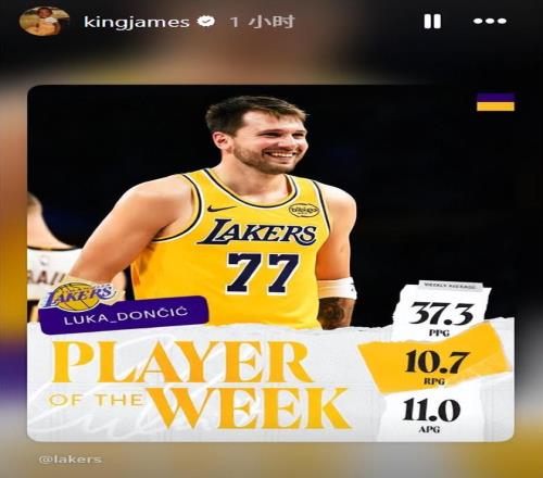 就在早些时候,东契奇当选西部周最佳球员,帮助湖人先后击败森林狼、公牛和掘金。他场均出战38.3分钟,得到37.3分,投篮命中率46.9%,三分命中率42.5%,罚球命中率79.2%,同时贡献10.7个篮板、11.0次助攻、2.0次抢断和1.7次盖帽。这位27岁的球星在这三场比赛中砍下两次三双、一次两双,并贡献了他加盟湖人后的首个50+得分表演。詹姆斯也第一时间为队友送上祝贺。