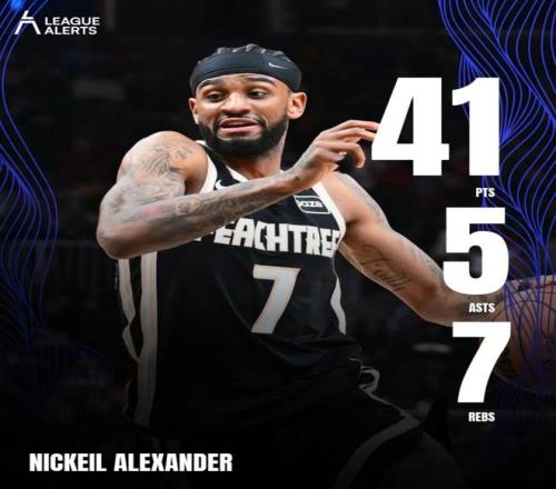 这场比赛,老鹰二当家亚历山大沃克打出了生涯之夜:全场出战37分钟,投篮21中12,三分14中9,罚球9中8,拿下41分7篮板5助攻2抢断。
