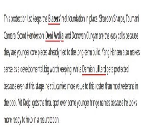 该美媒解析道:这份保护名单保留了开拓者真正的核心班底。夏普、卡马拉、亨德森、阿夫迪亚和克林根都是毫无悬念的保护人选,因为他们是球队长期重建计划里的年轻核心。