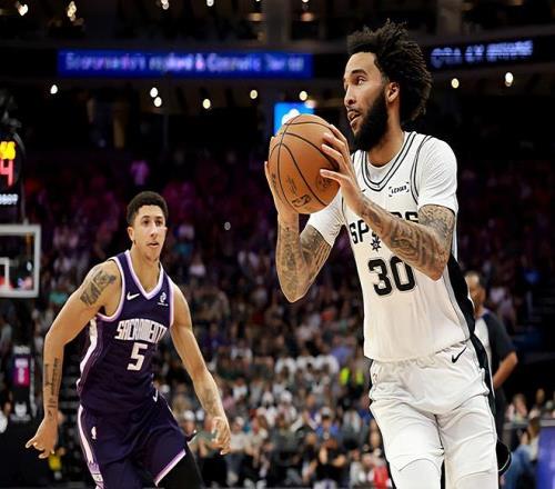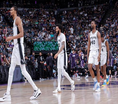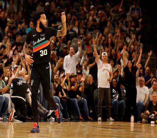 本场比赛中,马刺的先发锋线大将朱利安-尚帕尼(Julian Champagnie)的表现还是值得肯定的。尚帕尼全场出场23分30秒,投篮8中6,三分线外7中5,高效得到了17分1篮板1助攻的数据,还有2次失误,正负值为+11。尚帕尼在进攻端的表现非常出色,展现出了超强的得分能力和投射能力。尚帕尼的出手次数并不多,但是他却起到了关键的作用,发挥出了自己的作用。尚帕尼在防守端也依然保持了很高的水准。至少在本场比赛中,尚帕尼又一次在攻防两端都起到了效果,在出场时间和出手次数都非常有限的情况下打出了极其出色的表现,为球队的这场胜利做出了不小的贡献。