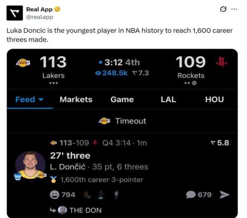 此役,东契奇还创下了NBA历史第1的神迹。数据显示,投进本场第6记3分球之际,东契奇(27岁19天)生涯已经投进1600记三分,NBA历史最年轻。