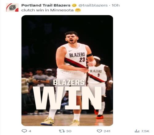 波特兰开拓者108-104险胜明尼苏达森林狼豪取三连胜。这场比赛开拓者上半场就领先9分,但第三节开拓者进攻效率下滑被森林狼缩小到1分,可在末节开拓者依靠防守重新建立优势最终拿下胜利。