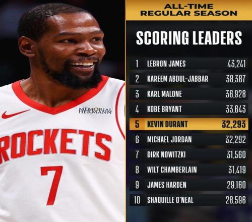 此役,杜兰特砍下27分,职业生涯总得分超越了乔丹,升至NBA历史第5位!