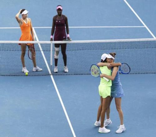 1月31日,张帅(右)/梅尔滕斯庆祝胜利。新华社记者 马平 摄