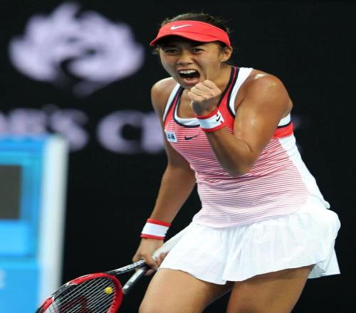 2016年1月19日,中国选手张帅在比赛中庆祝。当日,在墨尔本进行的2016年澳大利亚网球公开赛女单第一轮比赛中,中国选手张帅以2:0战胜罗马尼亚选手哈勒普,晋级第二轮。新华社记者 毕明明 摄