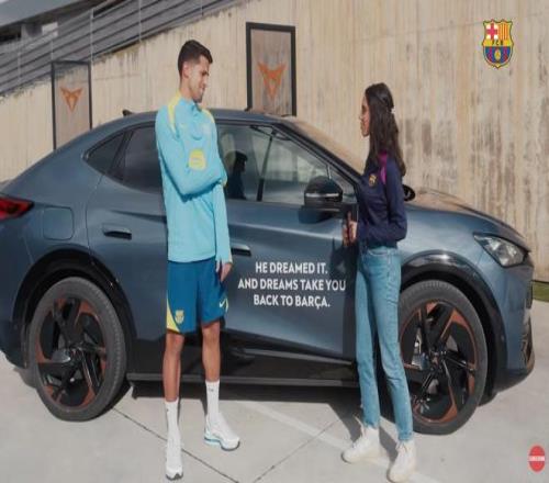 我们现在坐在一辆CUPRA里,这很特别,因为车上有一句专门为你准备的贴纸。如果你愿意,可以对着巴萨球迷大声读出来。