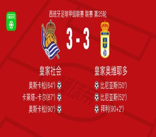 北京时间2月21日西班牙足球甲级联赛 联赛 第25轮,皇家社会主场对阵皇家奥维耶多。皇家社会奥斯卡松梅开二度,卡莱塔-卡尔破门。皇家奥维耶多比尼亚斯梅开二度,拜利破门。最终比分皇家社会 3-3 皇家奥维耶多。