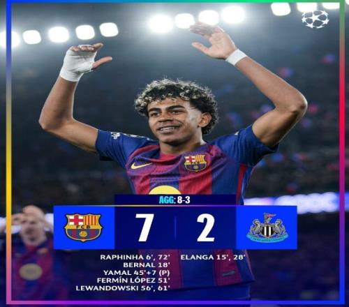 上半场比赛拉菲尼亚和贝尔纳尔两次帮助巴萨取得领先,伊兰加两次帮助纽卡扳平。半场补时亚马尔点射命中,巴萨3-2取得领先。下半场巴塞罗那火力全开,费尔明破门,莱万梅开二度,拉菲尼亚锦上添花,最终7-2赢下胜利,两回合8-3将对手淘汰出局。