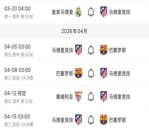 超级死亡赛程,马竞未来五场先战皇马,随后双线三战巴萨