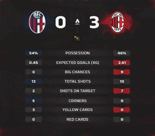 北京时间2月4日凌晨3时45分,意甲第23轮,米兰做客雷纳托·达拉拉球场对阵博洛尼亚。上半场,奇克错失单刀良机,随后奇克破门首开记录,恩昆库点射扩大领先优势。米兰半场2-0领先博洛尼亚。下半场,拉比奥特破门。最终米兰3-0击败博洛尼亚,本赛季联赛对博洛尼亚完成双杀,米兰已保持22轮不败,继续排名联赛第二。