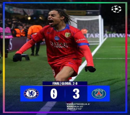北京时间3月18日,欧冠八分之一决赛次回合较量,同样3球落败的切尔西回到斯坦福桥球场迎战巴黎圣日耳曼。上半场比赛,萨尔开场停球出现失误,克瓦拉茨赫利亚扛开防守队员低射首开记录,巴尔科拉建功,切尔西短短8分钟内连失2球,克瓦拉茨赫利亚破门被吹,桑切斯化解单刀。下半场比赛,马尤卢破门扩大比分,切尔西反扑收获甚微。最终,巴黎圣日耳曼客场3比0、总比分8比2大胜切尔西晋级8强。