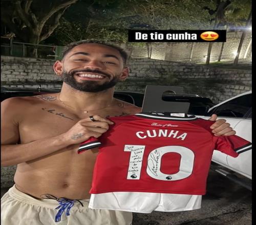 这位巴西人晒出了赤裸上身、手持曼联复刻球衣的照片。