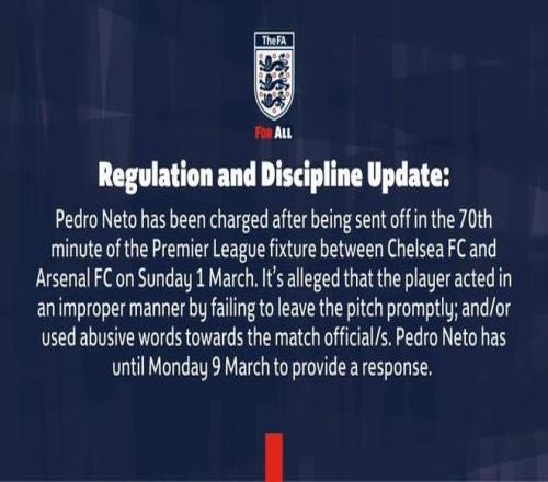 在3月1日进行的英超联赛切尔西对阵阿森纳的比赛中,佩德罗-内托在第70分钟被罚下场,据称,球员被指控未能及时离场,行为不当,并且对比赛官员使用了辱骂性语言,他需在3月9日之前作出回应。
