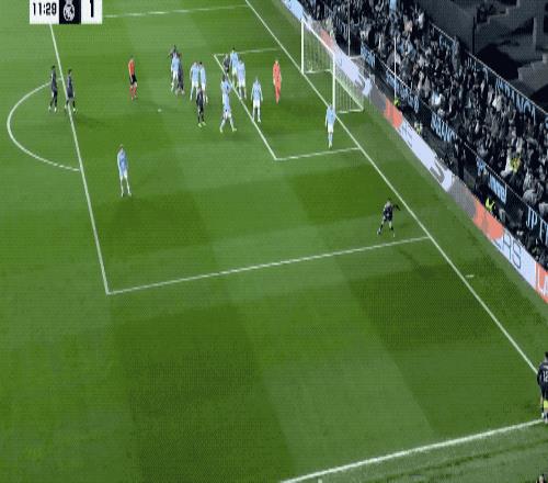 第11分钟,皇马开出战术角球,居莱尔倒三角传中,琼阿梅尼无人盯防的情况下,推射中柱,皮球弹进球门。