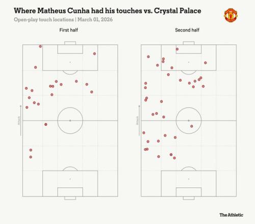 对水晶宫的比赛中,曼联左路进攻占比达到本赛季最低水平,如果不是水晶宫打了欧协杯体力不足,下半场还少打一人,曼联能否取胜也会构成疑问。