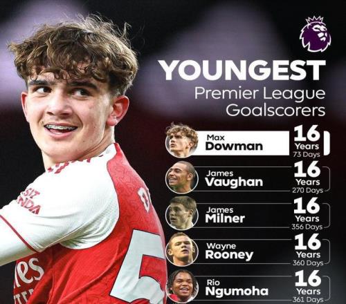 英超联赛至今,能在16岁取得联赛进球的仅有5人,而道曼直接将原有的英超最年轻进球者纪录大幅提前了将近两百天!
