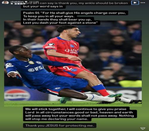 切尔西后卫查洛巴在与巴黎圣日耳曼的欧冠比赛中疑似受伤,赛后,查洛巴更新社交媒体,感谢耶稣保佑,他的脚踝没有断。