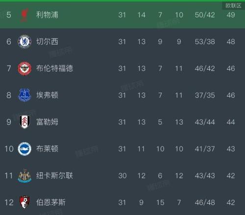 英超前31轮过后,利物浦积49分排名第五,切尔西48分第六,在他们身后的则是同积46分的布伦特福德和埃弗顿。此外如果本轮纽卡能够在主场拿下桑德兰,他们的积分也会来到45分。