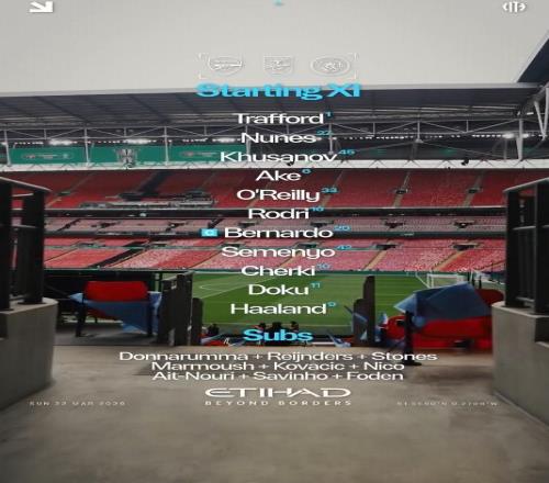 曼城首发:1-特拉福德、27-努内斯、45-胡桑诺夫、6-阿克、33-奥赖利、16-罗德里、20-贝尔纳多-席尔瓦、42-塞门约、10-谢尔基、11-多库、9-哈兰德