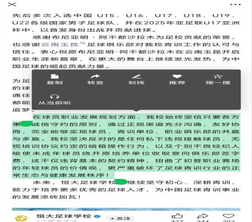 而在恒大足校的官宣中,着重提到了“在球员职业发展规划方面,我校始终坚信只要各方秉持诚信守约的原则,通过正规渠道充分沟通、友好协商,完全能够实现球员、青训单位、职业俱乐部的共赢与多赢。我校坚决反对的是任何私下违规接触球员、无视培训协议约定的暗箱操作行为,以及个别不良经纪人唆使未成年球员绕开原培养单位收取意向俱乐部签字费,这不仅违背基本的契约精神,扭曲了初登职业赛场的年轻球员的价值观,更严重破坏了足球青训行业的正常生态与健康发展秩序”!