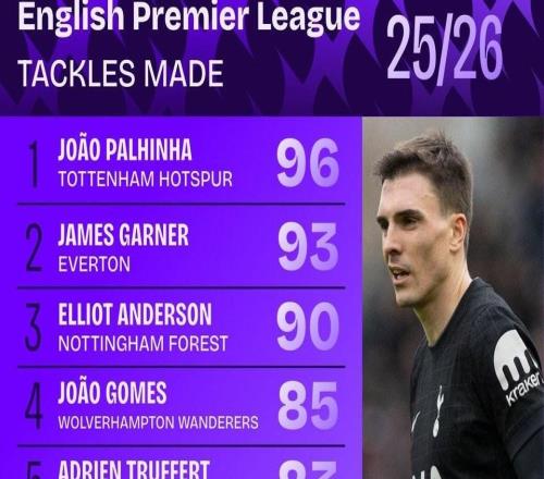 本赛季英超抢断榜:帕利尼亚96次第1,莫伊塞斯凯塞多第9