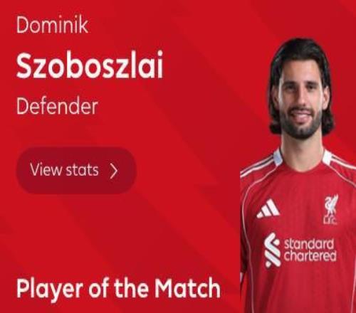 任意球破门,索博斯洛伊当选利物浦vs热刺全场最佳球员